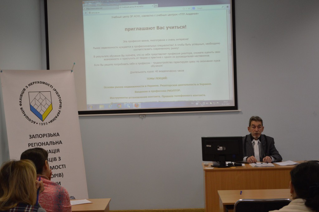 Поздравляем!!! В Запорожье состоялись курсы по обучению начинающих риэлторов. С уверенностью можем сказать что УСПЕШНО!!! Программа обучения была разработана для тех, кто не знаком с профессией и имеет желание себя в ней попробовать. Для ЗР АСНУ это первый опыт проведения первой ступени обучения и её очень не хватало, ведь сертификационные курсы больше направлены на подтверждение и повышение квалификации уже работающих специалистов. Обучение прошли 16 человек, из них четверо имели опыт работы в сфере недвижимости, при этом слушали спикеров с большим интересом. В преподавательский состав вошли директора агентств недвижимости и специалисты смежных профессий.