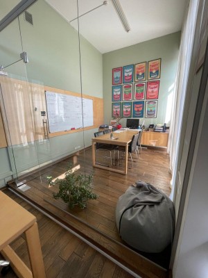 Площа 37 м². Складається з основної кімнати та окремого кабінету за склом. На поверсі лише два офіси - тиха робоча атмосфера. Додатково спільний коридор, санвузол, зона кухні, балкон. Є мікрохвильова піч і кавомашина, спільні для поверху.