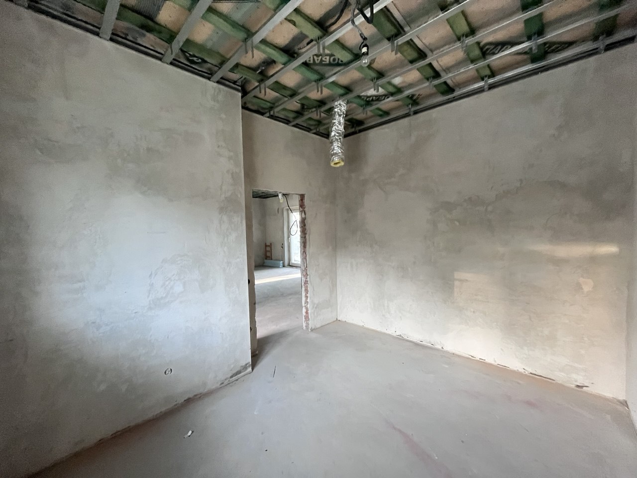 Планування: тамбур, коридор, вітальня з вже встановленим каміном фірми Dovre та виходом на криту терасу, кухня, дві спальні, санвузол, технічне приміщення та мансардний поверх оздоблений деревом з відкритим простором.