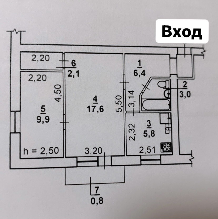 Загальна площа – 56,3 м.кв., житлова – 41,2 м.кв. (18,6+12,2+10,4), площа кухні – 4,8 м. кв.
